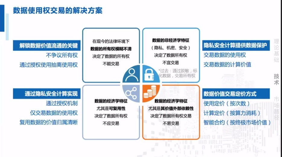在数据的所有权方面,陈恂认为可以把数据的所有权与使用权分离,数据不动,数据的价值动。如美国曾规定医疗健康的数据所有权归病人和医疗机构共同合法拥有,但在医疗机构内,将数据按照隐私保护需求进行层级划分,按需求流动使用,这样的案例可供在其他领域借鉴。宋晓冬则提到了数据权益的概念,从个人借贷、医疗保险等领域进一步举例说明数据亟需更合理的法规来支持并保护行业发展。最后,在数字经济、数字生态发展上,两位嘉宾都很有信心。宋晓冬指出当下需要新的范式、新的主体能够帮助数据更好地价值分配并使用,业界前沿的数据共地、数据公社就拥有技术和规则的双方支持。另外,数据托管、信托也将会有很大的发展。陈恂指出,数据生态需要有不同的参与者,数据供应方、需求方、监管方等重要角色从不同角度参与,完成生态净化,可以从单体平台数据源,走向数据源间联盟,最后完成计算和数据的互联。