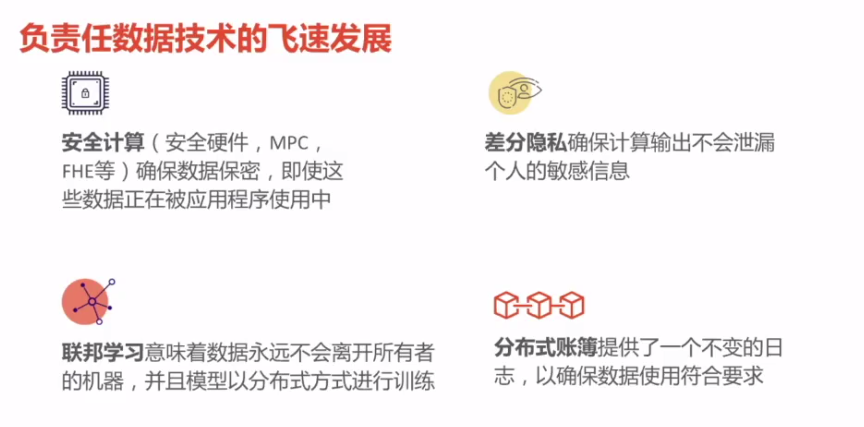 宋晓冬首先以“构建负责任的数据经济”为主题展开演讲。数据是现代经济的关键驱动力,但个人和企业对数据的保护和使用在当今面临巨大的挑战,构建负责任的数据经济框架刻不容缓。宋晓冬认为,负责任数据经济有三个目标原则,一是建立和保护数据权益,二是公平分配数据产生的价值,三是有效使用数据来实现社会福利和经济效率的最大化。当前需用安全计算、差分隐私、联邦学习、分布式账簿等数据技术来解决保护使用中的数据、控制数据使用、保护计算输出不泄露等传统方案无法保证的安全隐私的问题,也需要更有效的数据隐私法律监管和更公平的对数据产生的价值的分配。在未来十年,宋晓冬乐观地预测隐私安全计算会得到大量普及,数据信托、数据共地将占主导地位,大多数大型公司也将拥有首席负责人数据官。陈恂以数据要素出发,指出从信息时代到智能时代的变革中,应用先行已转化成数据先行,社会中最活跃的要素也从土地过渡到资本,再发展为数据,创造出难以预计的价值。当今中国的数字化程度排在全球前列,每天产生的数据量也将在2025年超过美国,所以数据这一资源作为人工智能的信息载体和重要支柱,对于国家的竞争力也十分重要。从市场的角度出发,陈恂认为数据具有独特的经济学特征,如重复使用、固定成本高、复制成本低廉、非竞争性、非排他性、外部依赖性、生成性等,在非经济学维度又带有隐私、合规、机密、安全的考量。陈恂从技术、行业规模等角度进一步展开对隐私安全计算的解读,并对隐私安全的生态体系未来在商业、消费、政府、科研等的应用进行了展望。